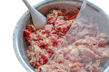 Raw minced pork ingredient food in cup on white background