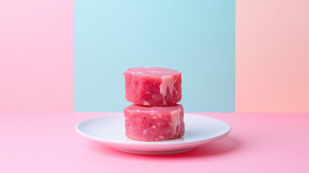 Vibrant pink tuna steaks sit elegantly on a white plate, juxtaposed against a soft pastel background, perfect for illustrating fresh culinary delights.
