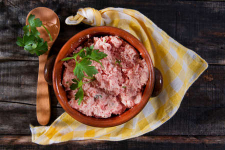 Raw chopped pork tenderloin with herbs in a glass bowl on a wooden board, selective focus