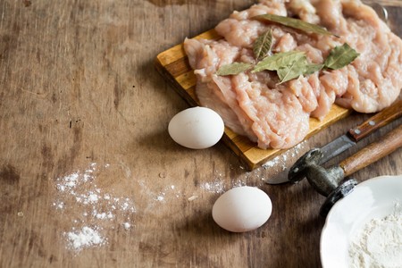 Tender chicken fillet knife hammer for beating the meat raw eggs bay leaf on the wooden table