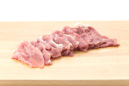 Sliced Raw pork loin cut into pieces on a wooden cutting board To prepare food.