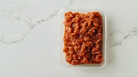 This image features freshly cooked minced chicken displayed in a clear glass container on a metallic surface, perfect for culinary presentations and healthy recipe ideas.