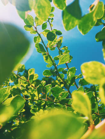 Tree leaf and branch flare light from above of the tree for Nature Background.