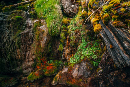 Beautiful wet mossy rocks with vivid greenery close-up. Colorful nature background with mosses on stones. Picturesque nature backdrop with rich vegetation on mossy cliff. Spring water flows over rocks