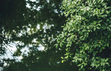 Tree branches with green foliage over lake water, top view, nature background. High quality photo