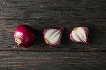 halved red onion on wooden background