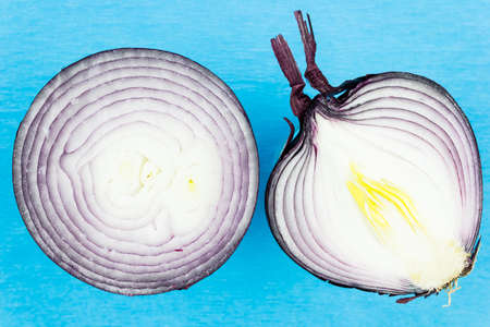 red onion slices. pattern texture on side position provides copy space for text. background concept isolated light blue background