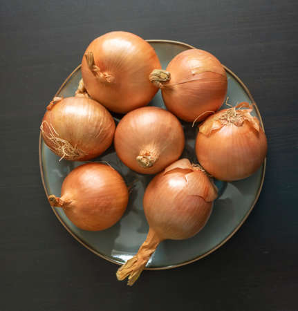 Onion bulbs on the plate with black wooden background.