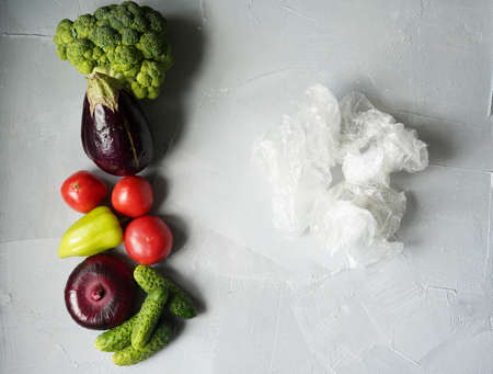 different vegetables lie in a row next to the plastic bags in which they were packed. zero waste concept