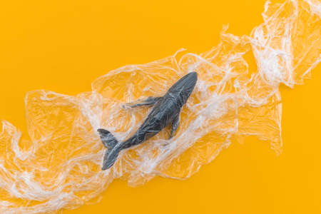 Humpback whale is entangled in a plastic bag. Plastic animal concept. Yellow background. Environmental pollution problem.
