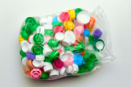 Polyethylene garbage bag with plastic lids of different colors.