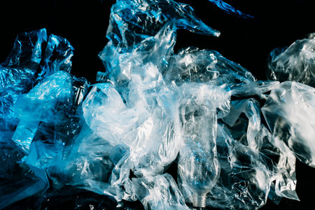 A picture of crumpled polythene packages in different sizes and shapes, set against a dark background for a layered effect.