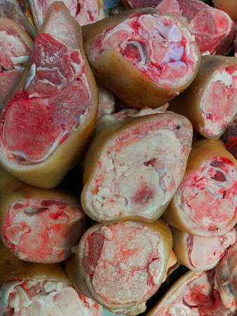 Close up of pork knuckle on display at butcher shop in a supermarket