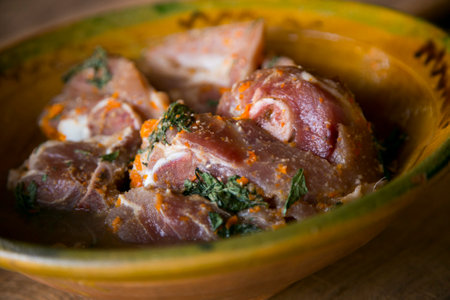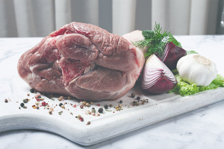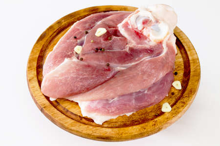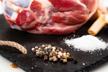 Raw pork knuckle, on a wooden chopping board, with spices, close-up, top view, no people,