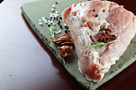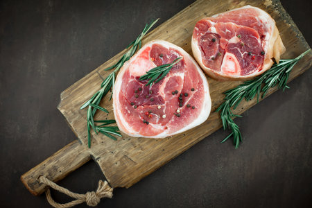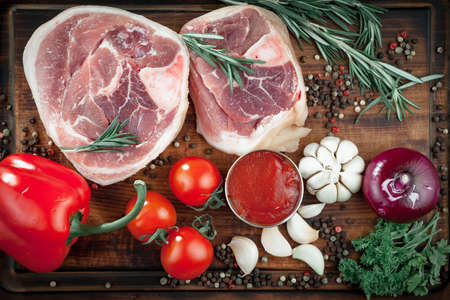 Shooting for the catalog.Raw pork shank with rosemary, cherry tomatoes and pepper on a wooden background. Space for text. View from above.