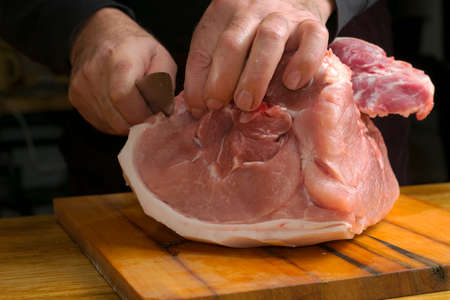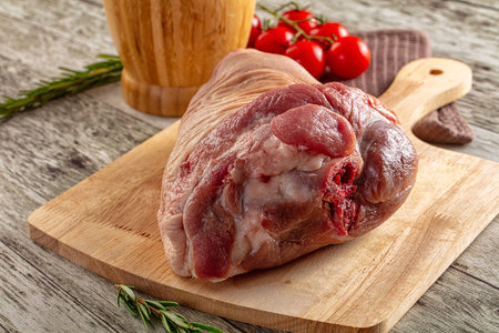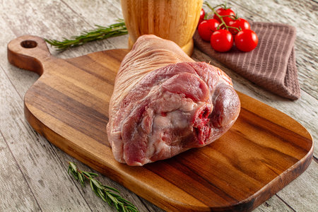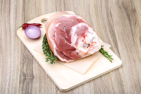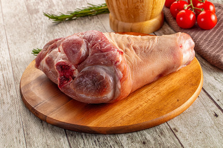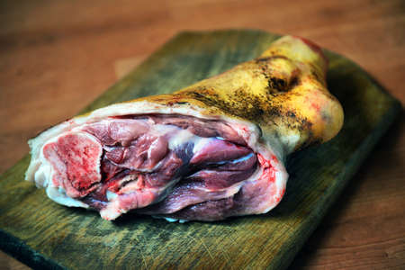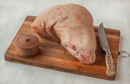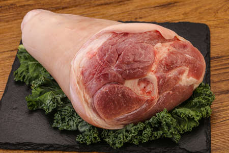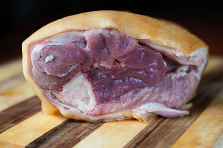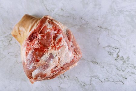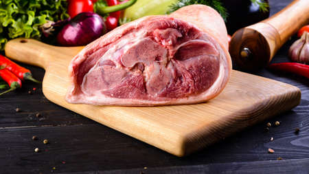 Raw pork knuckle meat on a kitchen table. Wooden background. Top view