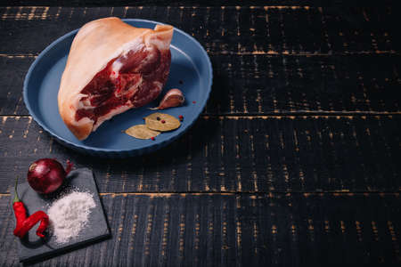 Raw pork knuckle on blue plate, seasonings, garlic, red onions, pepper set, bay leaf, salt on black wooden background. Cooking of meat dish, meal and flavors, cuisine.