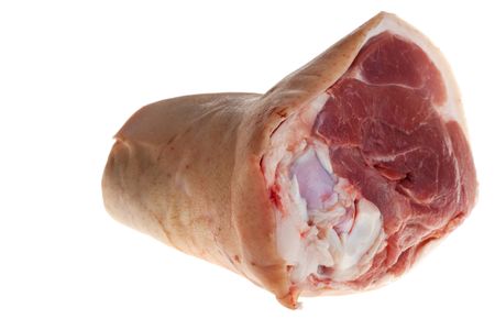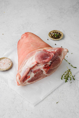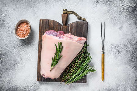 Raw Pork knuckle eisbein for cooking with herbs. White background. Top view