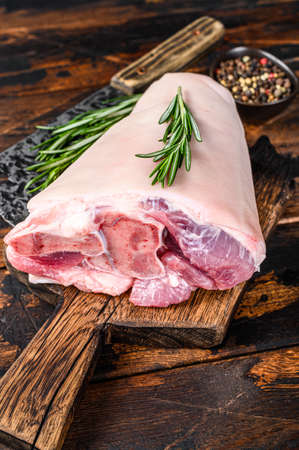 Raw pork Eisbein knuckle ham on a wooden board with meat cleaver. Dark Wooden background. Top view