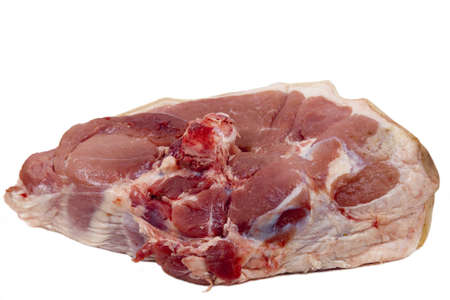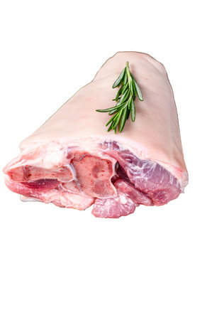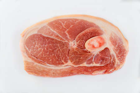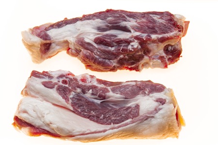 Sliced raw pork shoulder with skin on white isolated background. Top view.
