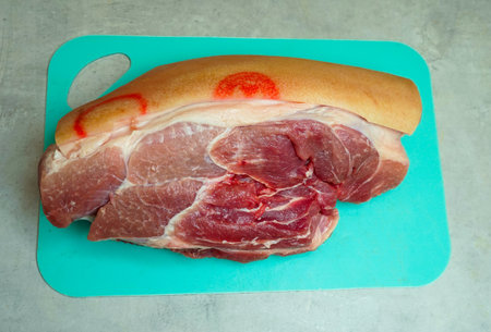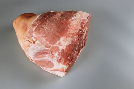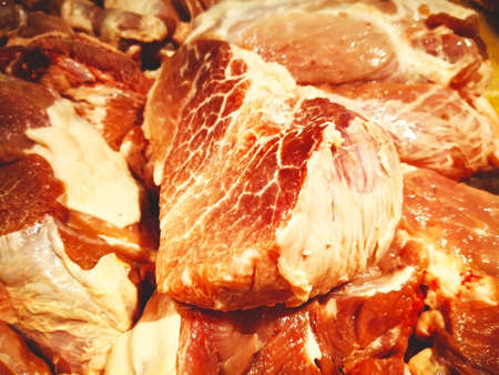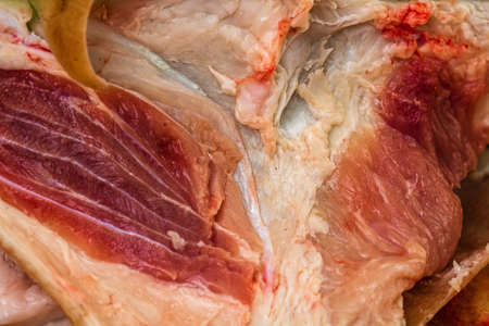Raw pork leg and belly meat in wholesale store. Uncooked pork fat and skin for background.