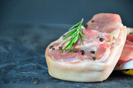 Raw Pork knuckle leg meat on kitchen table with herbs. Black wooden background. Top view. Copy space