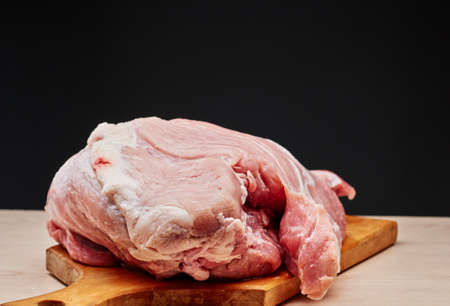 Raw pork ham cut on a wooden board. Leg meat on a light background, Culinary cooking. Long banner format. top view,