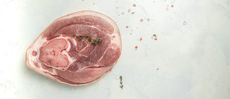 Raw pork knuckle meat on a kitchen table. Wooden background. Top view. Copy space