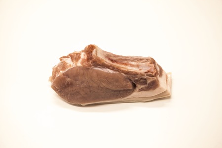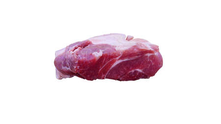 A piece of meat is on a wooden cutting board. The meat is cut into a wedge shape Pork meat isolated on a white background.