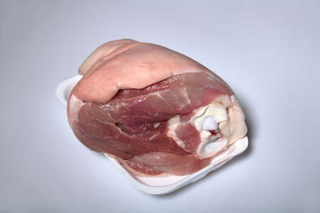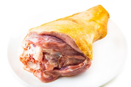 Raw pork knuckle on white plate on gray wooden background, closeup. Cooking of meat dish.