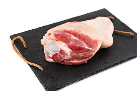 raw pork knuckle on black stone cutting board on white background. butcher shop.