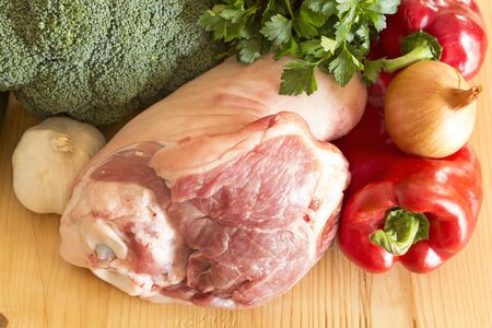 Raw pork leg on wooden cutting board ready for cooking with vegetables