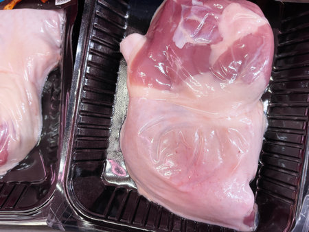 Raw chicken thighs in a vacuum package ready for cooking. Close up.
