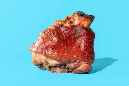 Close-up with a delicious pork knuckle cooked in german style, with dark beer. Roasted pork knuckle isolated on a blue background.