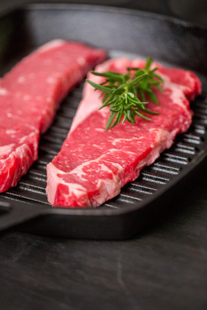 Raw New York strip steaks in cast iron frying pan.