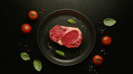 Fresh raw steak adorned with herbs and spices resting on a sleek black background, perfect for showcasing culinary creativity and gourmet food preparation.