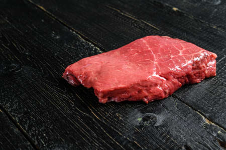 Top blade organic meat cut, raw marbled beef steak, On dark wooden rustic table, top view with space for text