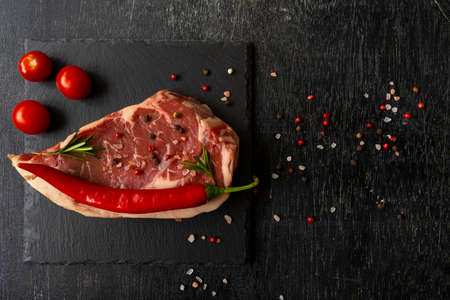 Raw piece of ribeye beef steak on slate board on a wooden table hot pepper smile, spice, himalayan salt, tomato. Fresh food. Everything for a barbecue.