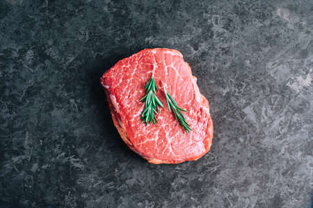 Raw beef steak with rosemary on a stone background. Selective focus.