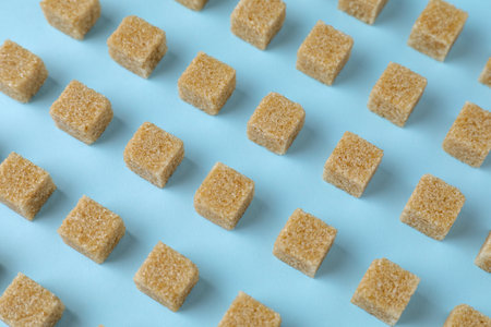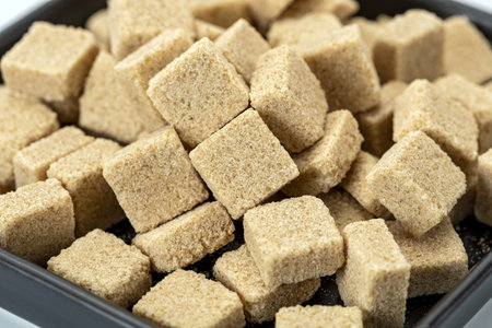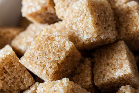 A brown sugar cubes closeup texture background natural sweetener organic ingredient healthy food macro shot rustic kitchen dessert preparation soft focus delicious and inviting