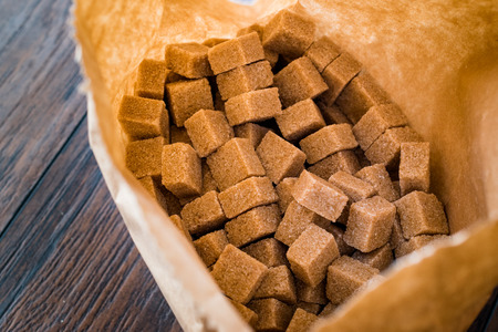 Package of Raw Organic Brown Sugar Cube in Craft Paper Ready to Eat. Food Product.