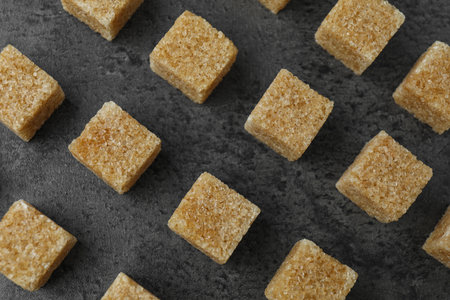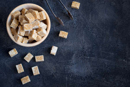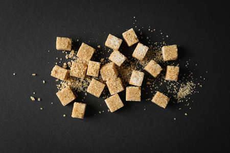 Cane sugar cubes, top view. Black background. Brown sugar texture