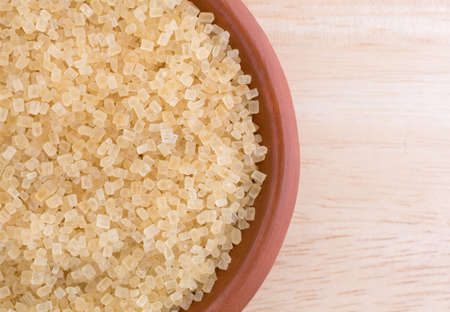 Top close view of a portion of turbinado sugar in a small bowl atop a wood table top.