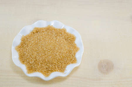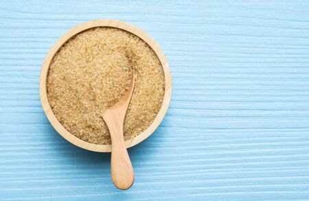 Brown sugar in a wooden bowl or wooden spoon Sugar for health Use for cooking or desserts on white and sugar backgrounds.