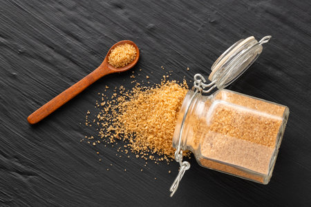 Saccharum officinarum - Brown sugar in a glass jar and spoon