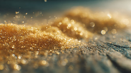 Macro shot of golden glitter scattered on a dark, textured surface, creating a sparkling and luxurious effect.