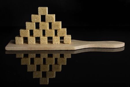 Lot of whole sweet brown sugar cube on small wooden cutting board isolated on black glass