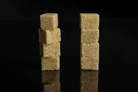 Group of eight whole sweet brown sugar cube isolated on black glass