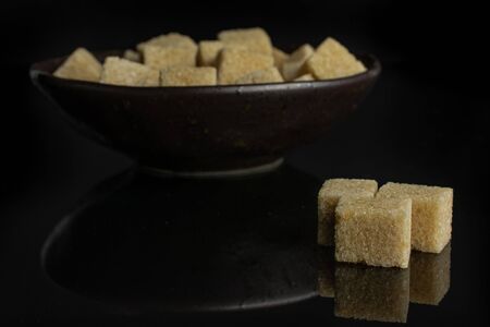 Lot of whole sweet brown sugar cube in dark ceramic bowl isolated on black glass