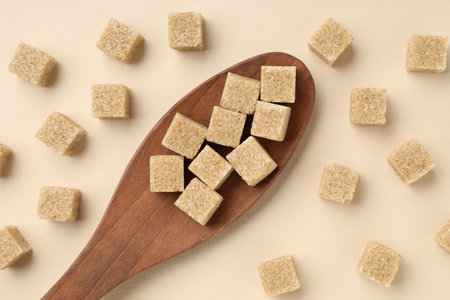 Brown sugar cubes and wooden spoon on beige background, flat lay